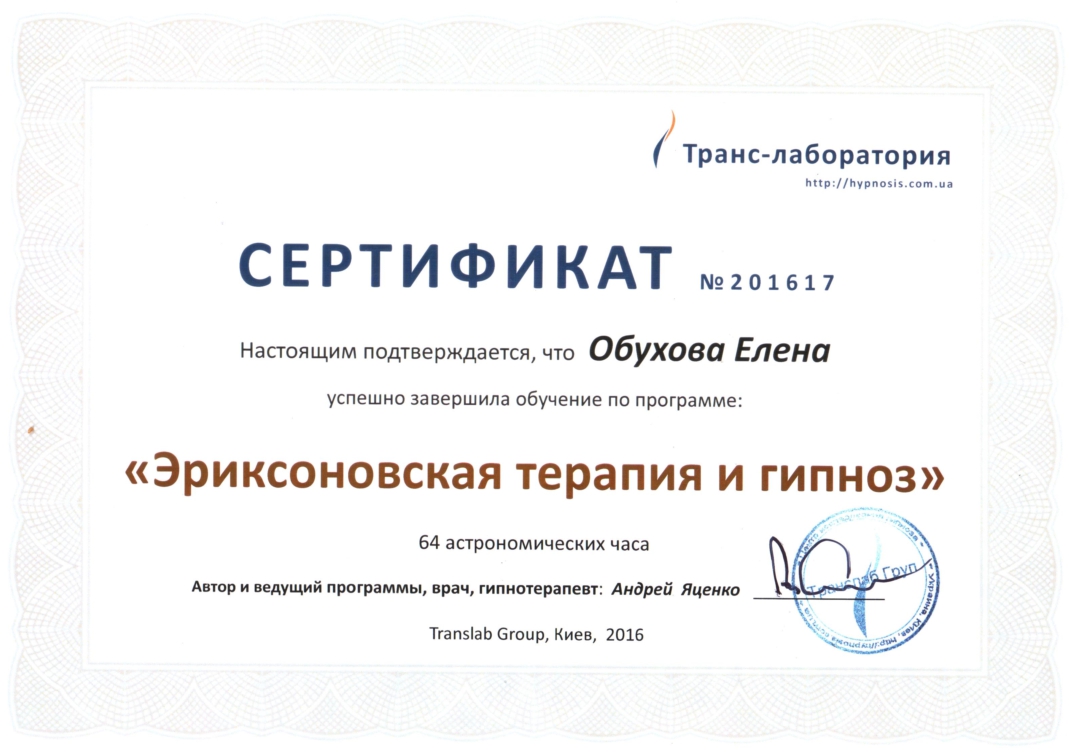 Базовые эриксоновские гипнопрактики в течение предыдущих лет 5-ти лет я получала у Татьяны Русиной, сертифицированного мастера от Крымского центра НЛП и гипноза. Но я не позиционировалась как сей практик, просто на основании этих знаний я писала свои книги и гипнотические тексты статей, от которых нельзя оторваться при чтении)).