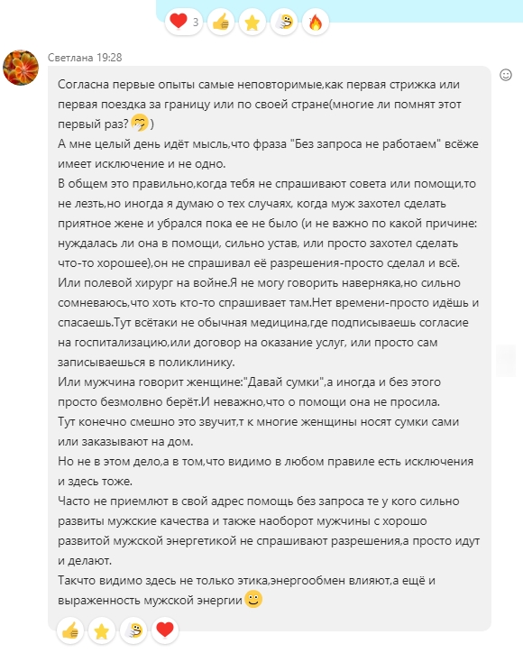 Всё правда.Вы всё верно сказали, Алёна.Очень трудно , если женщина является мамой, а если и не одного ребёнка, посвящать себя чему-то кроме семьи.Быт занимает много времени, а если ещё женщина работает по найму, то на себя не остаётся времени .А ооочень хочется.Этот чат- как глоток свежей родниковой воды . Надежда, что будет время , и сможешь поучить всё желанное, самое важное в жизни.И будет- кому учить.Вы когда-то сказали, что всему- своё время.:$