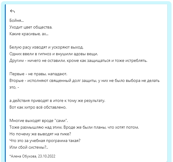 Из внезапного: международная знатная мастерица вдруг делает эфир о мо*илизации, и чистке в связи с этим, отсутствии страхов и т д.