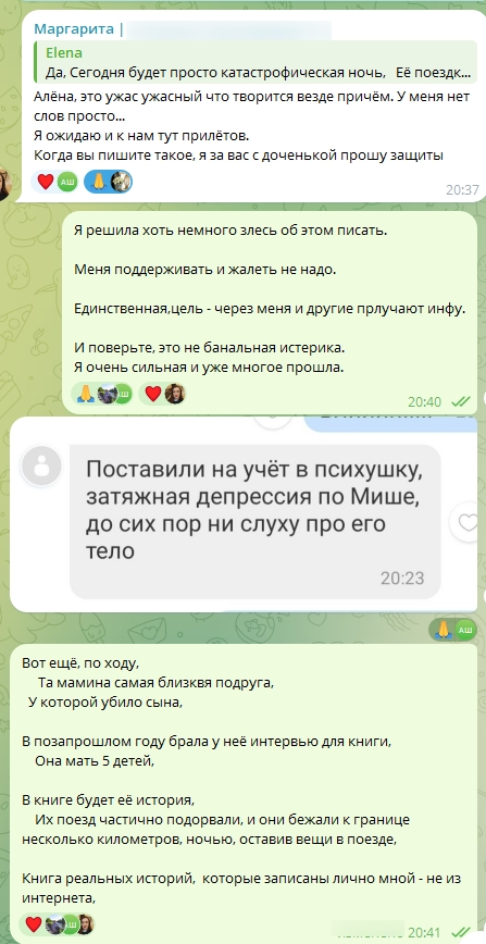 Был момент, когда она набрала меня, от страха, когда упало рядом, - думала, что последний момент жизни, и хотела слышать меня.