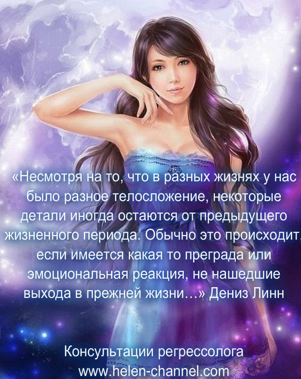 "...И еще один момент, читала недавно, что наши прошлые жизни (примерно последние 7-9 воплощений) накладывают очень сильный отпечаток на нас в этих воплощениях, вплоть до того, что переносится цвет глаз, размер ноги, структура тела ит.д. В воплощении, где я была ныряльщицей, род деятельности привел к тому, что я как бы усохла телом. В просмотре меня поражало мое невероятно маленькое и очень худенькое тело. Приводя параллель с этим воплощением, могу сказать, что у меня никогда не было «проблемы лишнего веса». Я могу есть когда угодно и что угодно без страха, что съеденное как-то отразится на моей фигуре. У меня скорее другая проблема, как часто нужно есть, чтобы не исчезнуть совсем".
