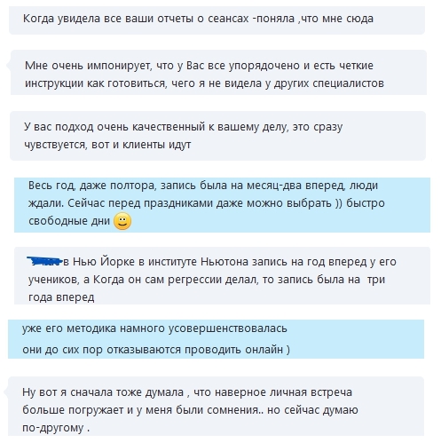Клиентка поведала интересную историю. Она искала в своей местности регрессолога, чтобы пройти погружение 2на земле». Даже обращалась в Институт Майкла Ньютона в Нью-Йорке. Там оказались свои нюансы (годовое ожидание и т.д..). Она искала «без профанаций», серьезного специалиста. Для моего проекта в целом такая обратная связь очень важна. Это очень ценно для меня: