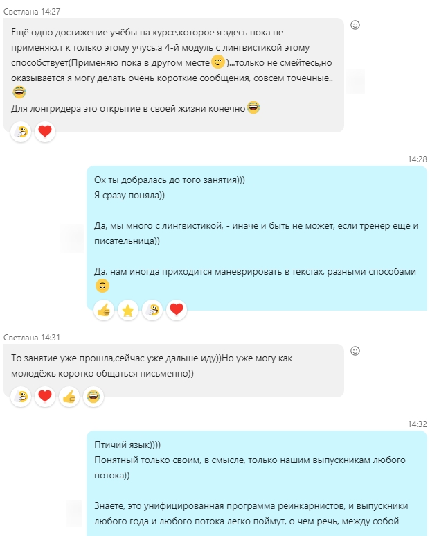 А мы с самого первого занятия первого модуля сходу учимся лингвистике, как развернуть человеку его самого, подсветить ему то, что он сам о себе не знает или не видит...