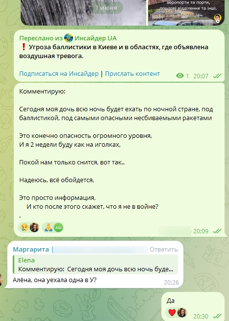 Был момент, когда она набрала меня, от страха, когда упало рядом, - думала, что последний момент жизни, и хотела слышать меня.