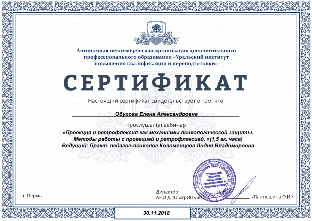 • (моя учеба) сертификат: механизмы пси-защиты: проекция и ретрофлексия
