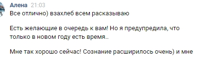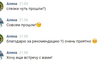 Я в полном восторге. Все мои близкие заметили изменения. Ребенок теперь получает больше любви и внимания. Я улыбаюсь. Спасибо, уважаемая Алена! Низкий поклон за реанимацию!!!! Я живу))