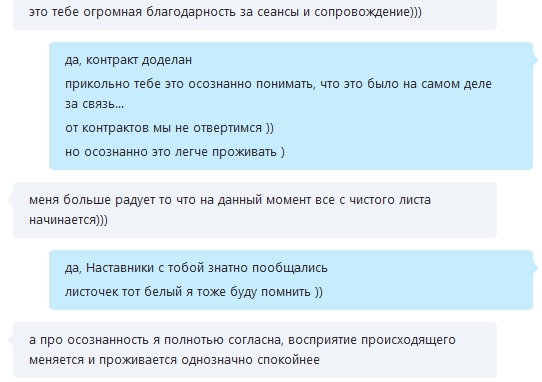Придумать что-то в сеансе нереально и это радует. Во всех трёх сеансах я так или иначе подходила к одному и тому же вопросу с разных сторон и мне давали одинаковый ответ. Очень чёткий и понятный.