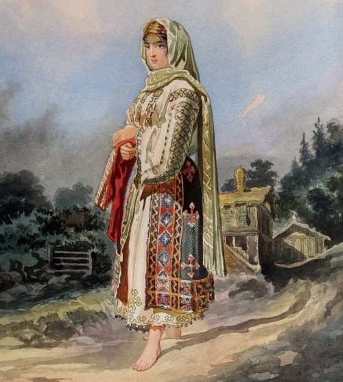 Озеро в лесу, вокруг горы. Карпаты. Румыния. 15-17 век. Девушка. Миниатюрная с длинными темными волосами и очень белой кожей. Белое платье с красным орнаментом и черный фартук (передник) с красными полосками. Двое детей. Муж. Влюбился с первого взгляда, но сомневался в своем выборе всю жизнь. Девушка счастлива и спокойна.